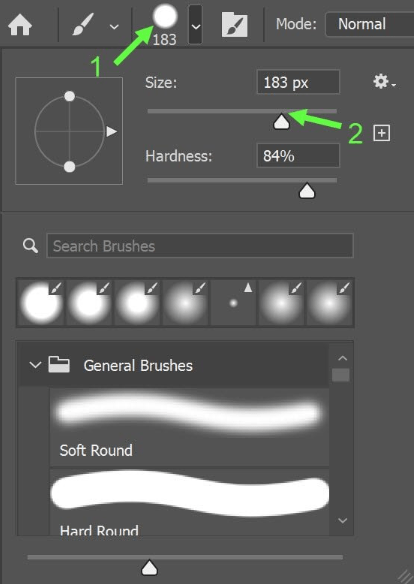 Pull the Size slider to the left or right to change the brush size. The slider just below controls the hardness of the brush.