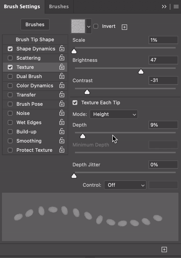 You can adjust Depth in the Brush Settings under Texture. Moving the Depth slider lets you control how strong or light the brush marks appear on your artwork.