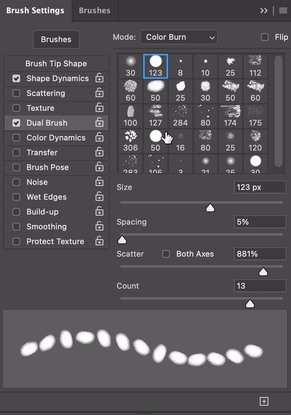 Dual Brush combines two different brushes to create more complex and unique brush strokes.